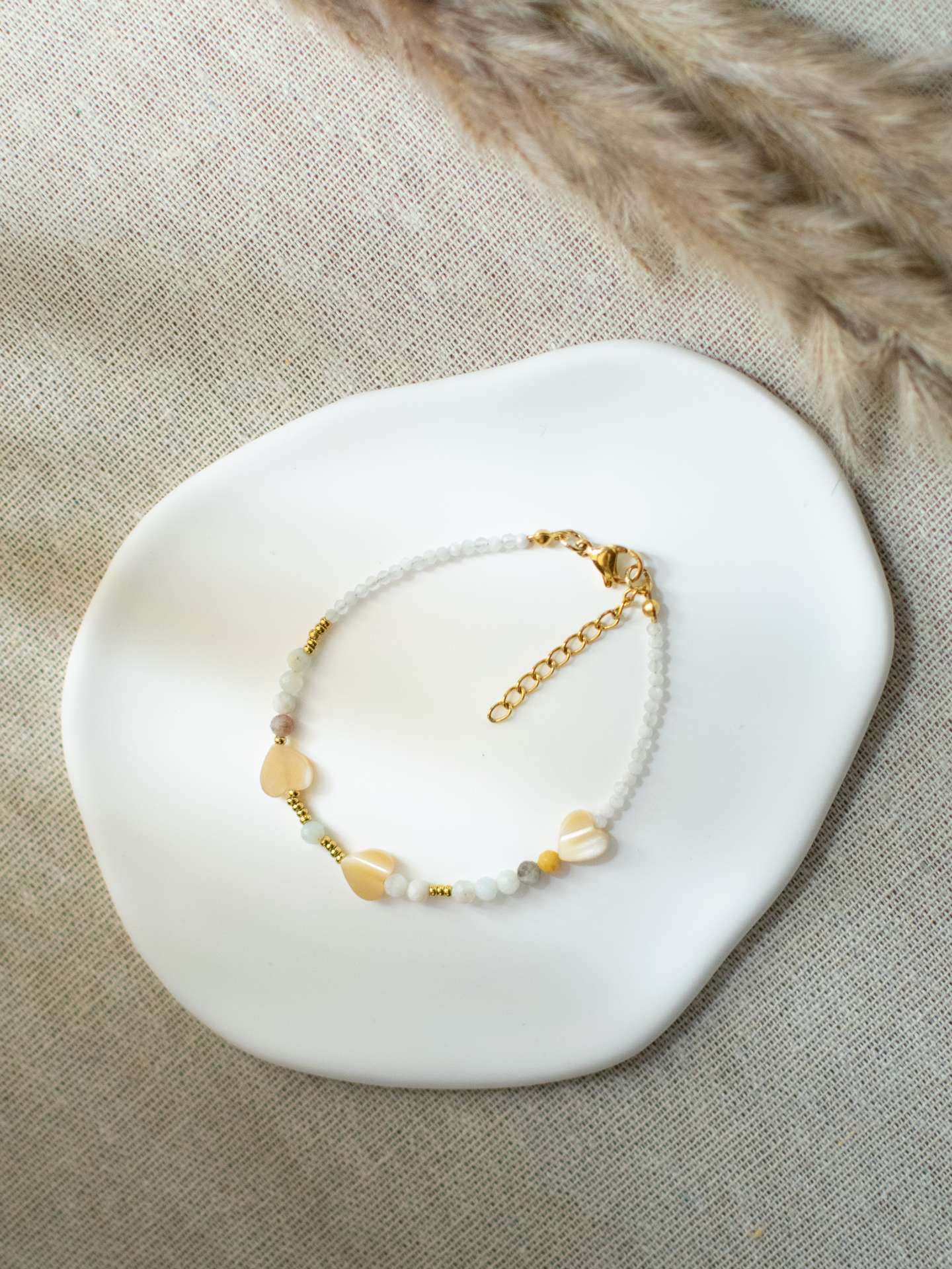 Kamień księżycowy – wypełnienie; Amazonit+ kuleczki ze stali nierdzewnej – kodują datę; Serduszko z masy perłowej – to kropki w dacie.