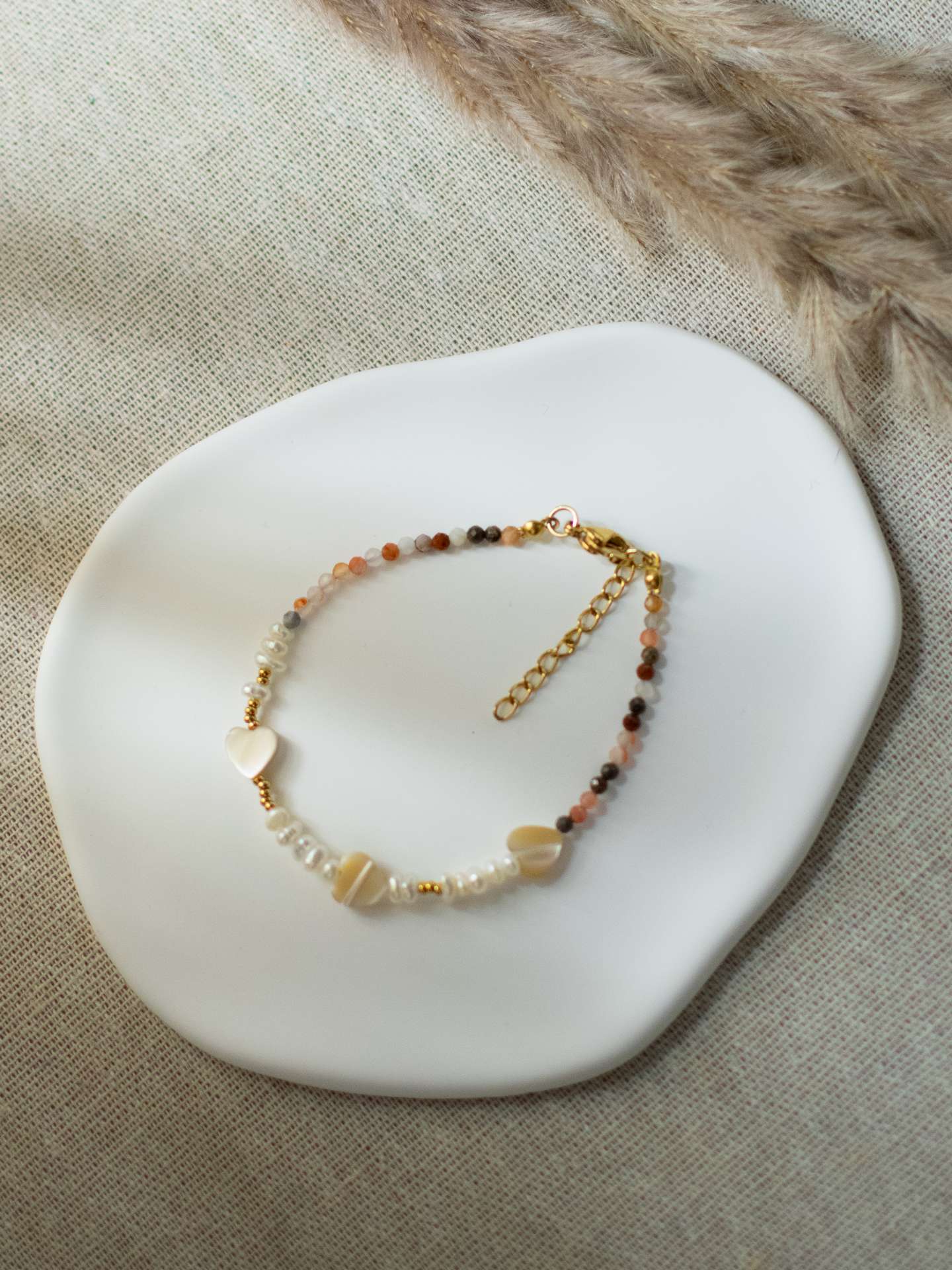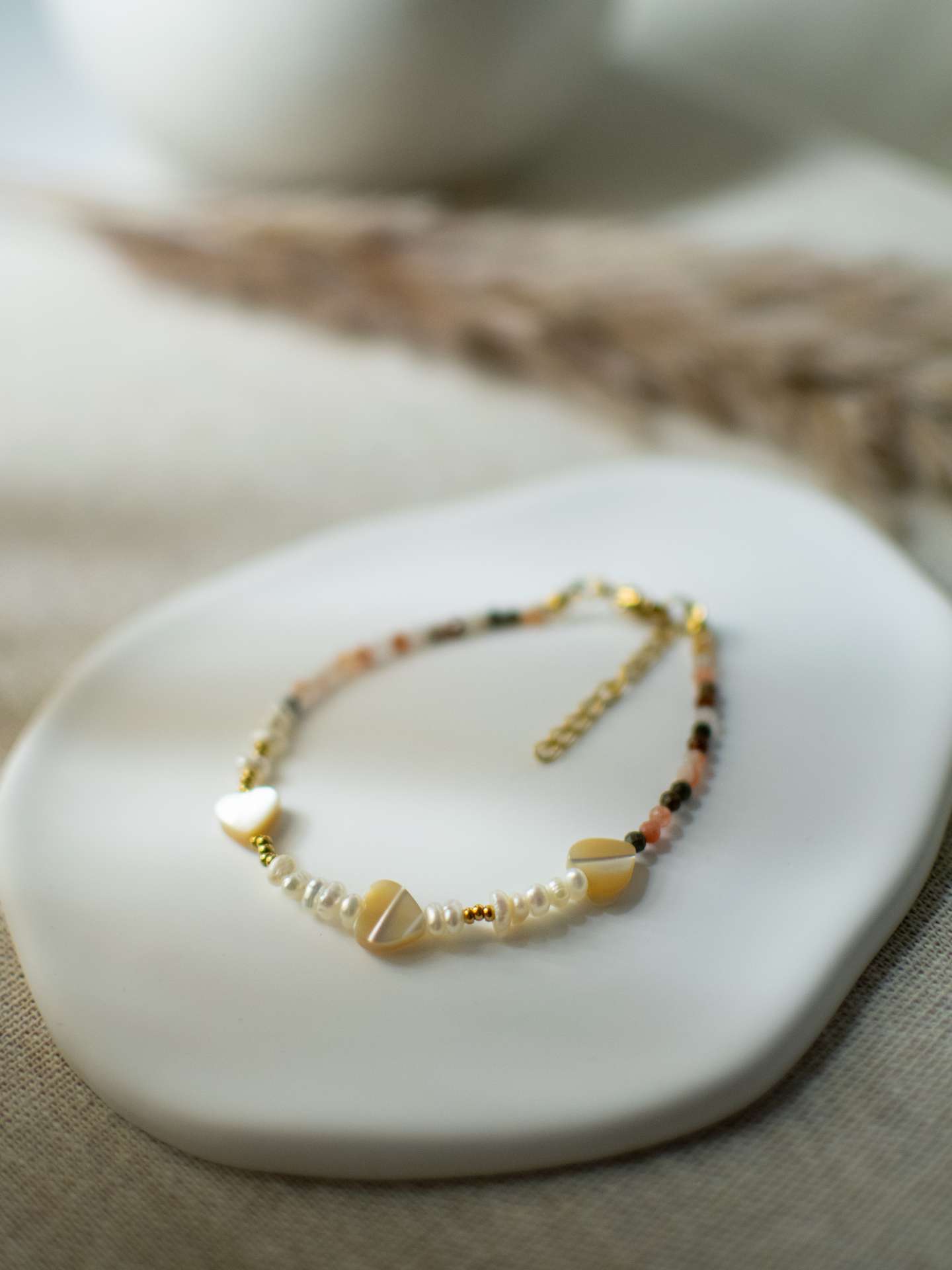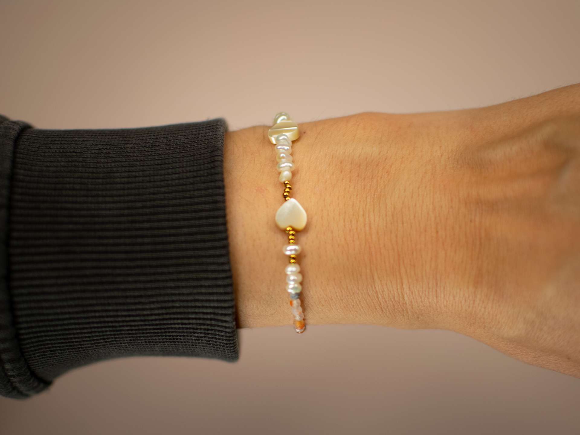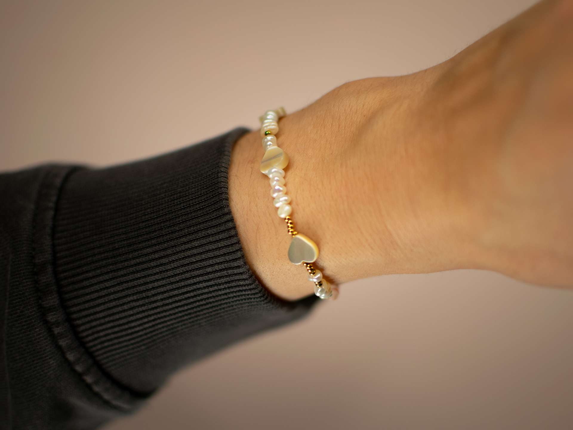 Serduszka z masy perłowej – znak czułości i miłości. Podkreślają romantyczny charakter bransoletki i dodają jej miękkiego, świetlistego wyrazu. Każde serce jest niepowtarzalne.
